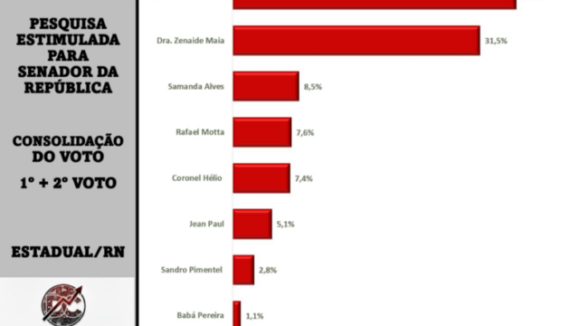 O senador Styvenson lidera com 36,1%, seguido pela senadora Zenaide Maia, com 31,5%. Em seguida aparecem Samanda Alves, com 8,5%; Rafael Motta, com 7,6%; Coronel Hélio, com 7,4%; Jean Paul, com 5,1%; Sandro Pimentel, com 2,8%; e Babá Pereira, com 1,1%.