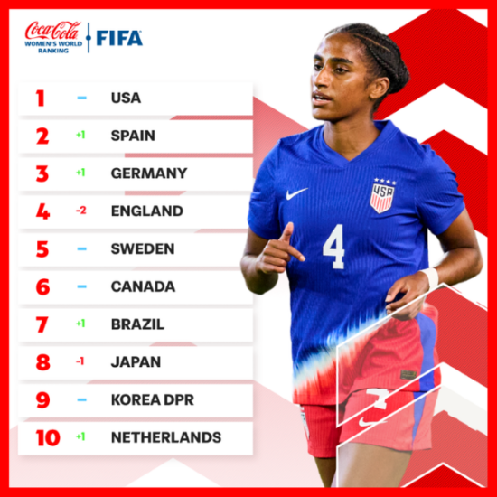 O ranking de seleções femininas da Fifa é liderado pelos Estados Unidos, com 2.087,55 pontos, tem a Espanha na segunda posição, com 2.028,65 pontos, e a Alemanha como terceira colocada, com 2.012,29 pontos.