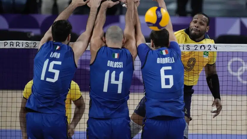 A seleção brasileira masculina de vôlei tropeçou diante da campeã mundial Itália na estreia da fase de grupos da Olimpíada de Paris na manha deste sábado 27, na Arena Paris Sul. O Brasil chegou a ter vantagem nos dois primeiros sets, mas oscilou em momentos decisivos, principalmente com erros no saque e bloqueio, e acabou superado por 3 sets a 1 (parciais de 23/25, 25/27, 25/18 e 21/25), na partida do Grupo B.