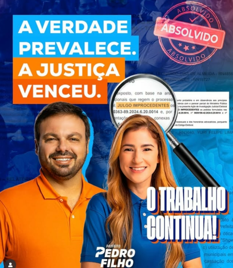 O prefeito de Touros (RN), Pedro Filho, foi absolvido de todas as acusações em ação movida pelo partido União Brasil, na qual era investigado por supostas irregularidades durante o período eleitoral de 2024. Saúde RN