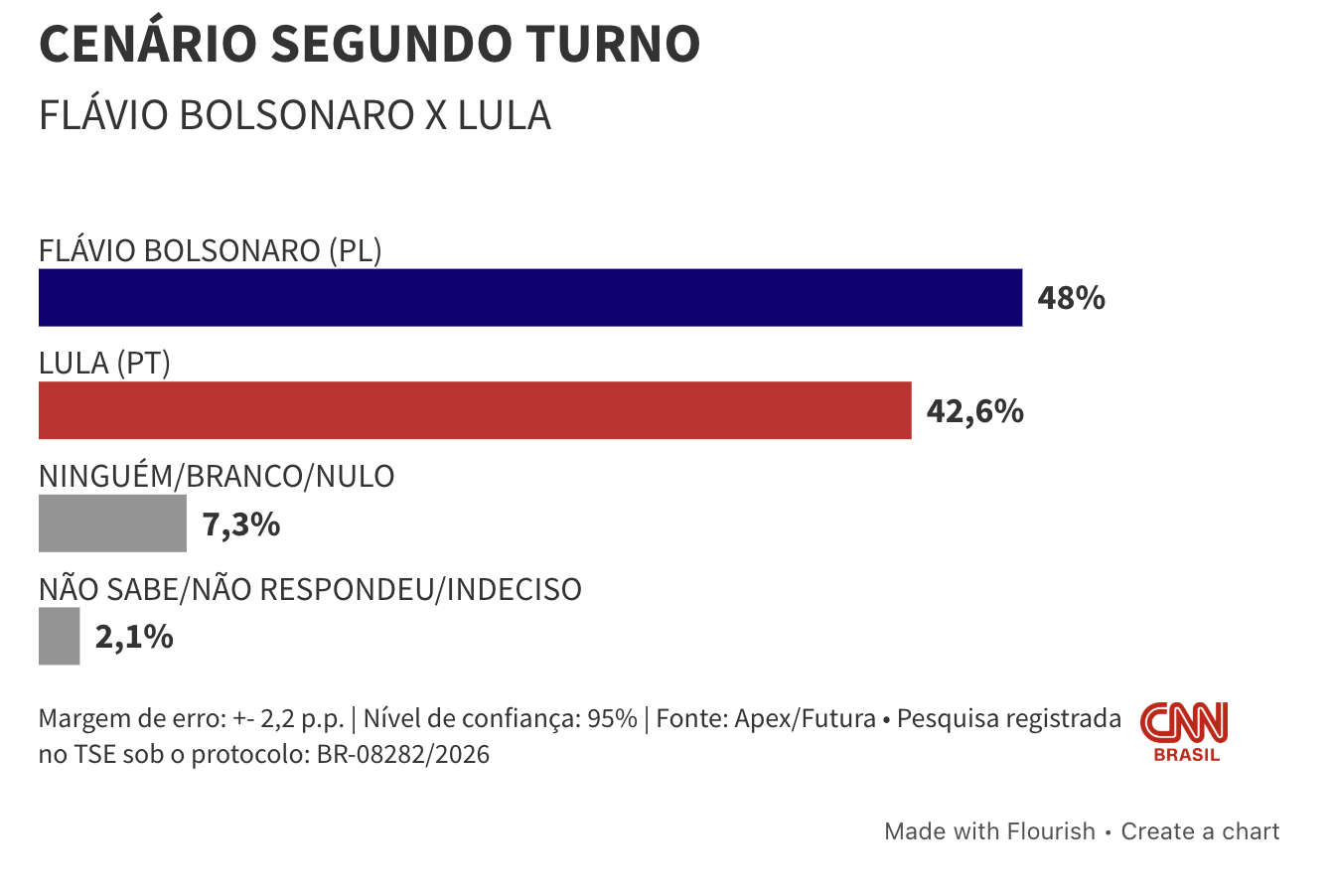 O senador e pré-candidato Flávio Bolsonaro (PL) aparece à frente do presidente Luiz Inácio Lula da Silva (PT) em um eventual segundo turno, segundo pesquisa Futura/Apex divulgada nesta terça-feira (14). O levantamento indica 48% das intenções de voto para Flávio Bolsonaro, contra 42,6% para Lula.