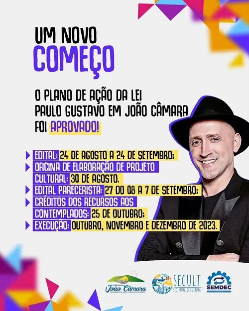 O munícipio de João Câmara RN garantiu mais de 320 mil reais através do plano de ação e a adesão ao processo, o que contemplará mais de 100 artistas e entidades culturais da municipalidade.