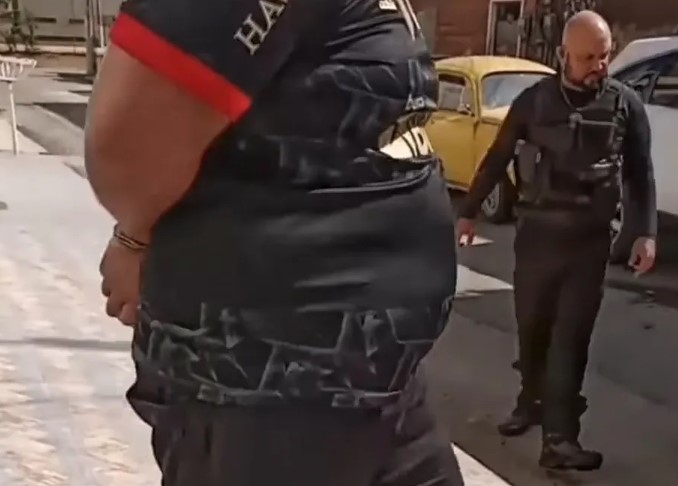 O criminoso aparece vestido de preto, observado por um homem algemado, que seria o dono do veículo.